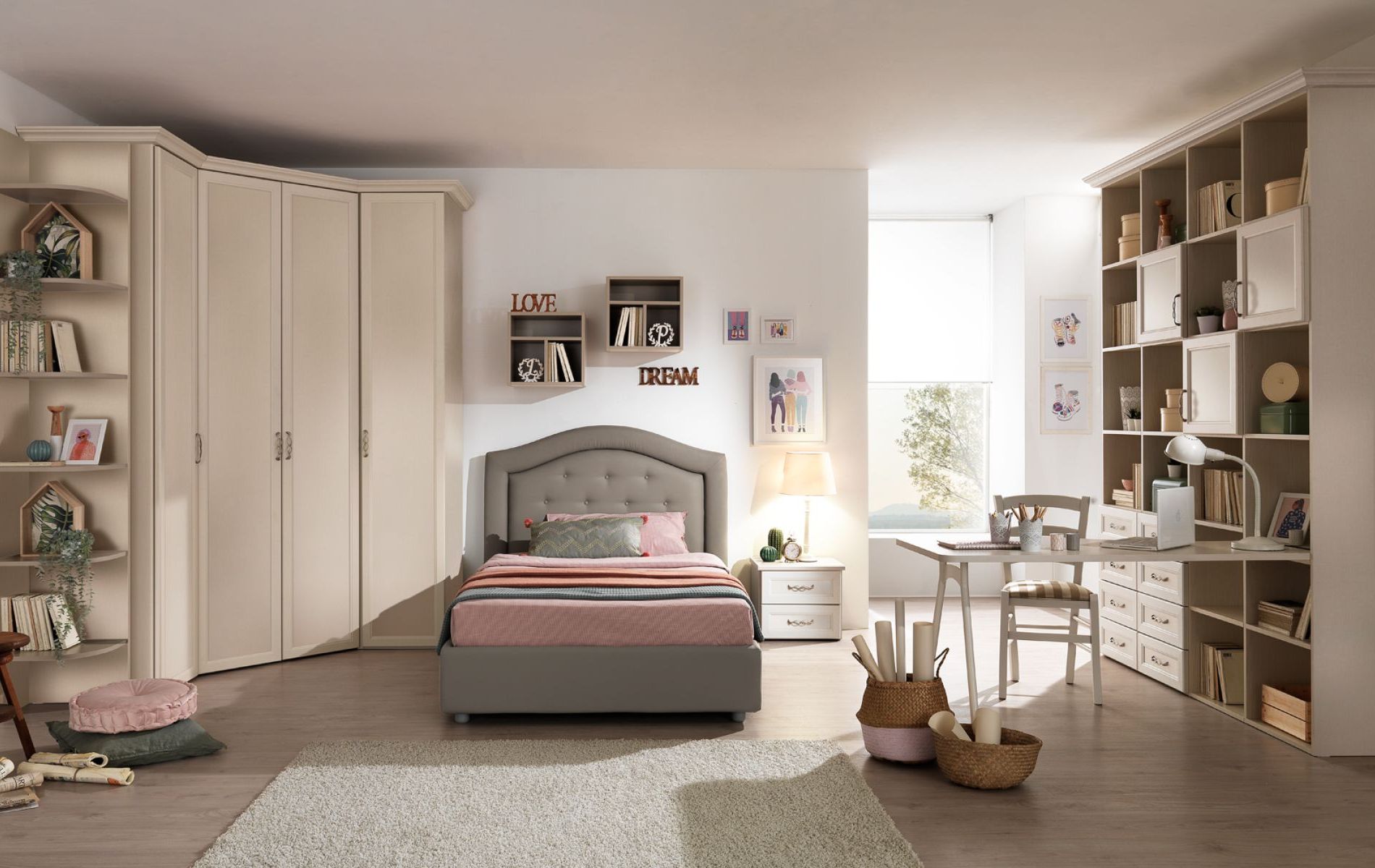 Nelle nostre camerette classiche per ragazzi si fondono classe e funzionalità, creando un ambiente che rispecchi la loro personalità e soddisfi le esigenze quotidiane. Con arredi dal design intramontabile e soluzioni efficienti, ogni spazio è pensato per garantire comfort e organizzazione. Zone studio accoglienti, aree dedicate al relax e mobili spaziosi ben organizzati rendono la cameretta il luogo ideale per coltivare passioni e vivere ogni momento con stile in un ambiente armonioso e accattivante.