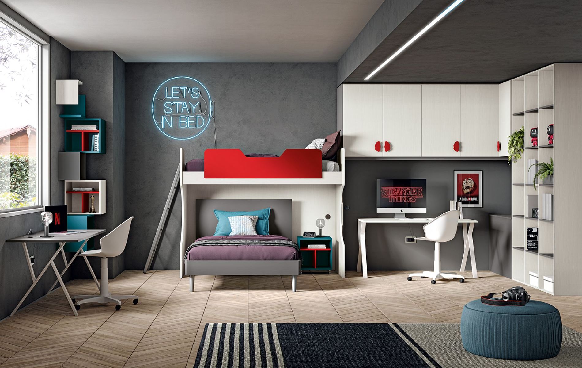 Le nostre camerette per adolescenti sono ideate per adattarsi alla loro crescita e al loro bisogno di indipendenza. Con un design contemporaneo e funzionale, ogni spazio combina estetica e praticità. Spazi studio ben attrezzati, armadi ampi e soluzioni versatili per offrire comfort e soddisfare le esigenze di organizzazione. Un ambiente che permette ai ragazzi di esprimere la propria personalità, favorendo un'atmosfera rilassante e stimolante che li accompagna nel loro percorso di crescita e scoperta.